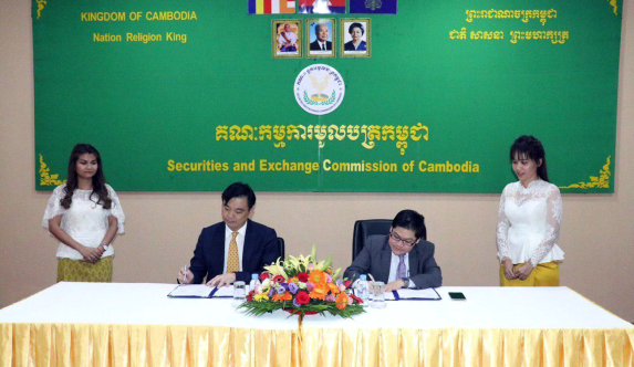 Securities and Exchange Regulator of Cambodia (SERC) Director General H.E. Mr. Sou Socheat (right) signs a Memorandum of Understanding on the Development of the Cambodian Securities Market with Chairman Wei.