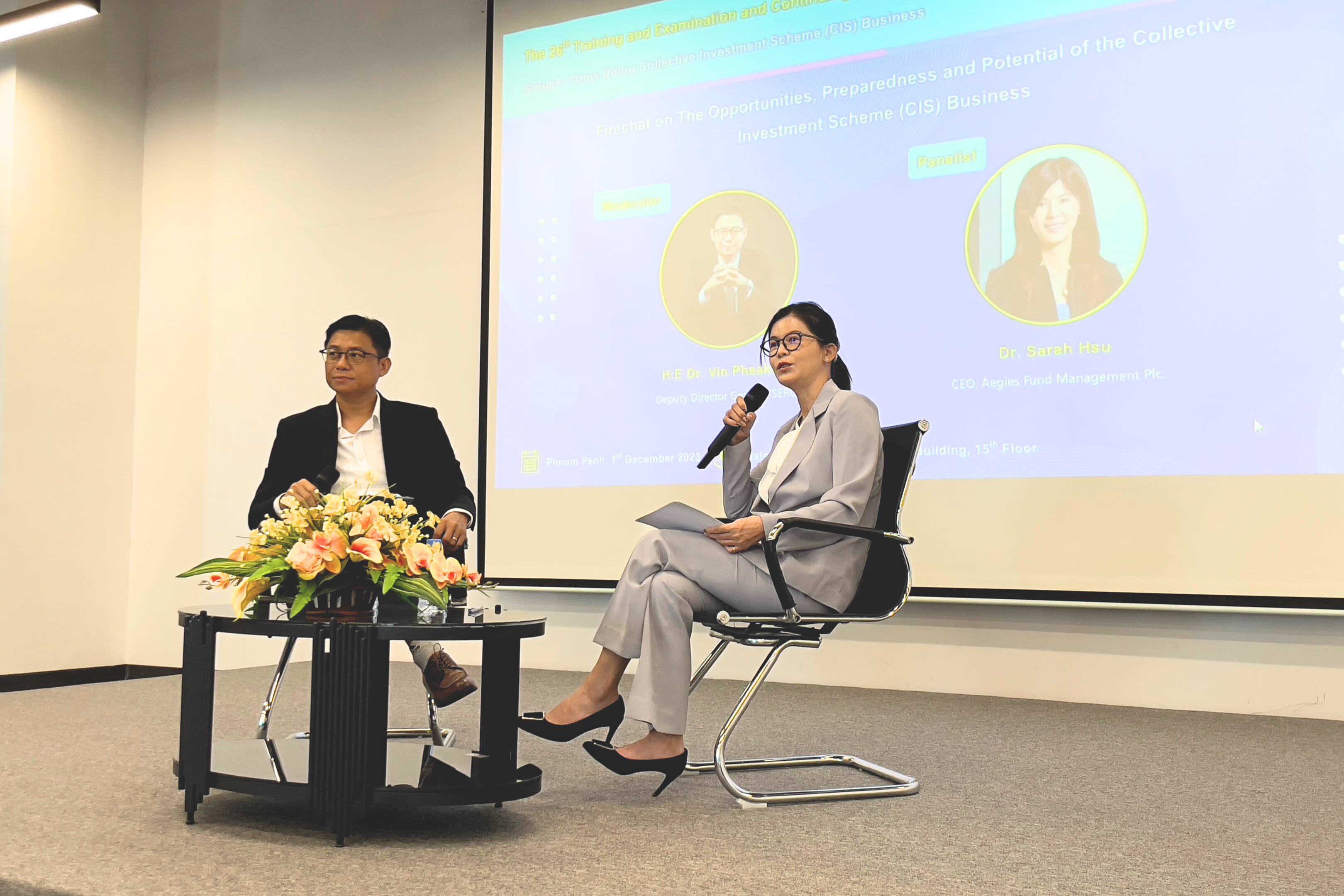 Aegies is honored to be invited by the Securities and Exchange Regulatory Commission of Cambodia (SERC) as a speaker for the 26th Securities and Fund Practitioner Training Course on December 7, 2023. Dr. Vin Pheakdey, H.E., Deputy Director of Fund License Issuance and Administration of SERC, and Dr. Sarah Hsu, CEO of Aegies, shared their views on " Opportunities, Readiness, and Potential of Collective Investment Schemes" with practitioners, exploring the investment advantages of pooled investment schemes and how to utilize Fintech to achieve financial inclusion and enhance the efficiency of financial services, as well as the investment benefits and market opportunities created by the Aegies Money Market Fund!